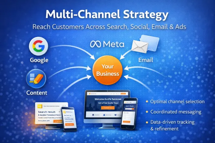"Reach your audience wherever they spend time online. We plan and execute across the right mix of search, social, email, paid ads, and content channels so your brand shows up consistently — and converts reliably"